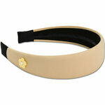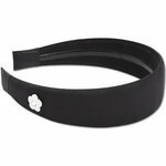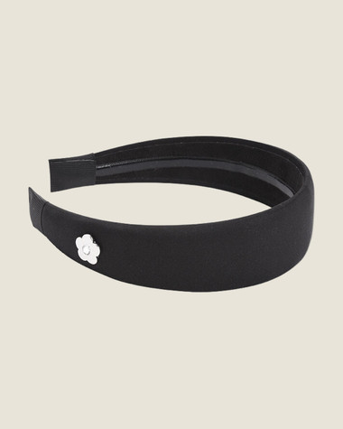 This is a wide 1960s style hairband, made from shiny satin material with a small daisy accent with a gem in the centre.